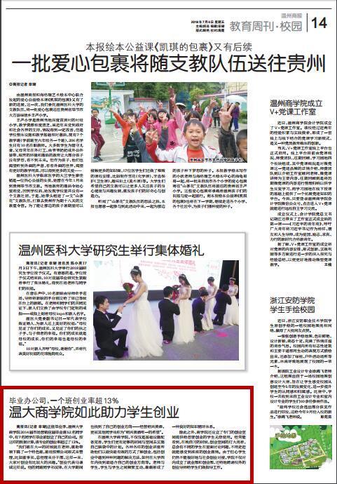 2014届市场营销应届毕业班52名同学 中,有7名同学在毕业前创立了自己的公司。按 这样的数据计算,该专业的创业率超过了13%。 “我们班在大一的时候就在老师、班助带 领下搞了一个特色班,班级按照公司形式来管 理,比如董事长、总经理来分干部,这样一来, 大家对创业有比较大的兴趣。”创业代表马谦 诚这样说。他的同班同学祁汉锋,在大学期间 也找到了自己的创业方向——经营绍兴黄酒, 更被其他同学戏称为“绍兴黄酒唯一的希望”。 在魔镜号