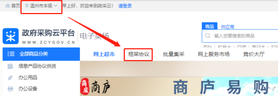 培训服务供应商可在政采云(//www.zcygov.cn)的“框架协议”栏目中查询,查询时注意左上角地域设置为“温州市本级”(见下图)。