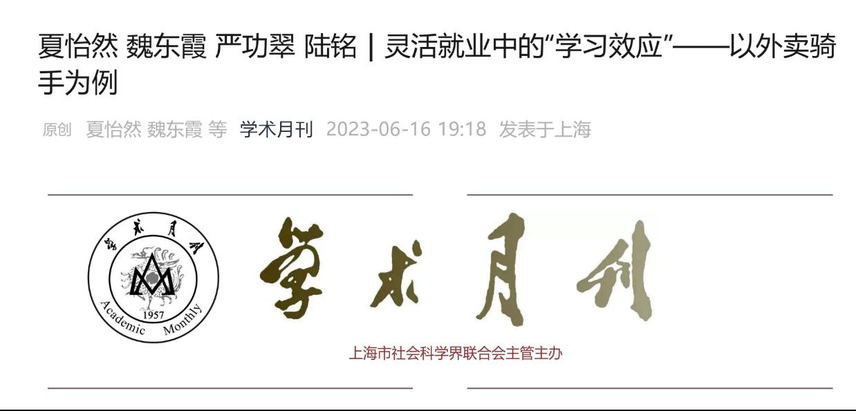 夏怡然教授以第一作者身份与广东金融学院魏东霞教授、上海交通大学严功翠老师、上海交通大学陆铭教授合作在人文社会科学北大核心、CSSCI、AIM权威和社科基金资助期刊《学术月刊》上发表题为《灵活就业中的“学习效应”—以外卖骑手为例》的论文。