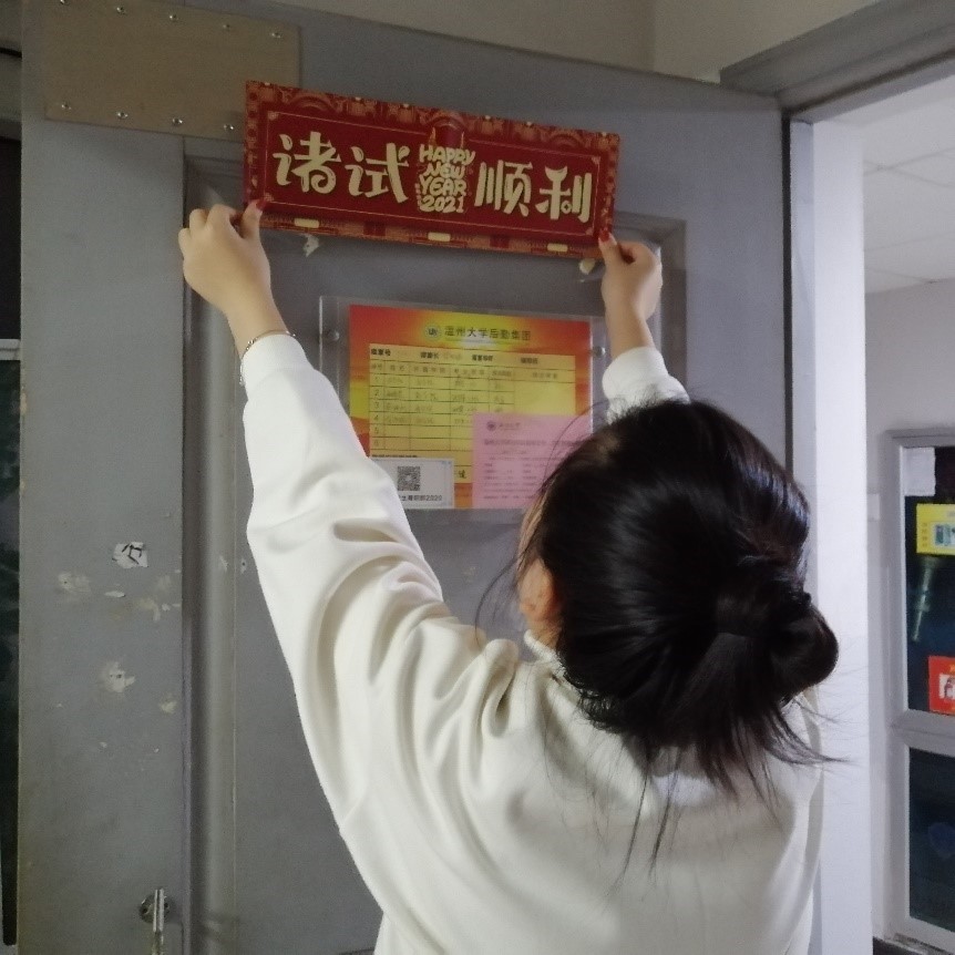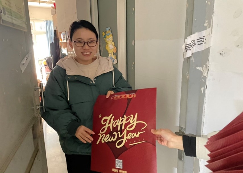 学生党员们纷纷手持印有“新年快乐”、“诸试顺利”、“福”等标语的卷轴,分组进入新生宿舍,向同学们表达问候和祝福。同学们面对学生党员热情洋溢的祝福,个个眉开眼笑,纷纷鼓掌表示感谢。寝室内充满着欢声笑语,到处洋溢着欢乐的新年氛围。