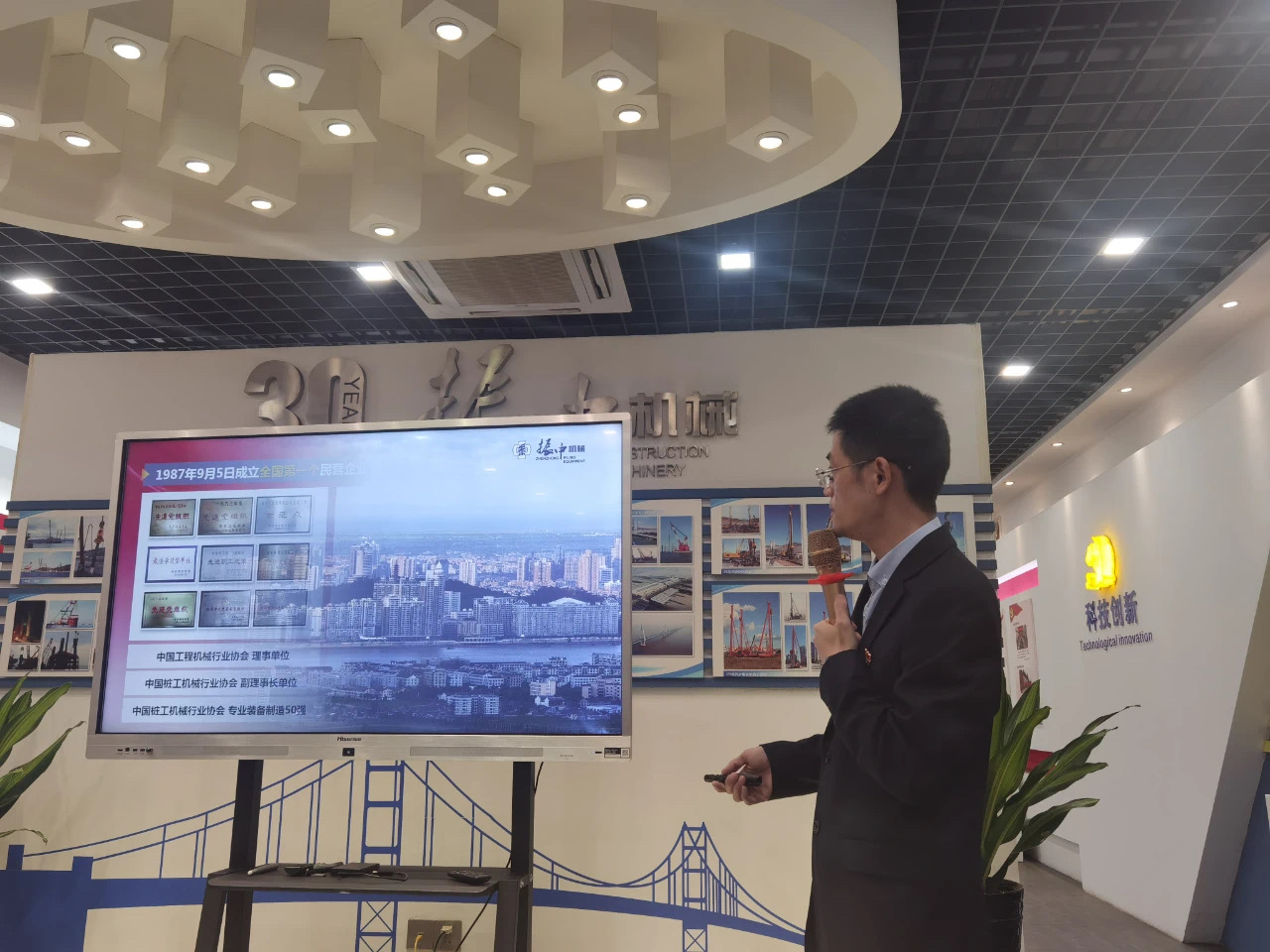 在振中公司的非公党建主题展厅里,同学们在讲解员的讲述中了解到,振中公司始创于1983年,随着第一台振动打桩机DZ30Y的试制成功,开启了企业进入桩工行业领域发展的新征程。三十年磨一创,三十年振中人的桩工情怀,造就了如今行业内响当当的“振中”品牌。1987年振中成立了全国第一个民营企业党支部,扬起了非公企业飘扬的第一面红旗,从此写下了温州非公企业党建探索实践之路的开篇一笔。