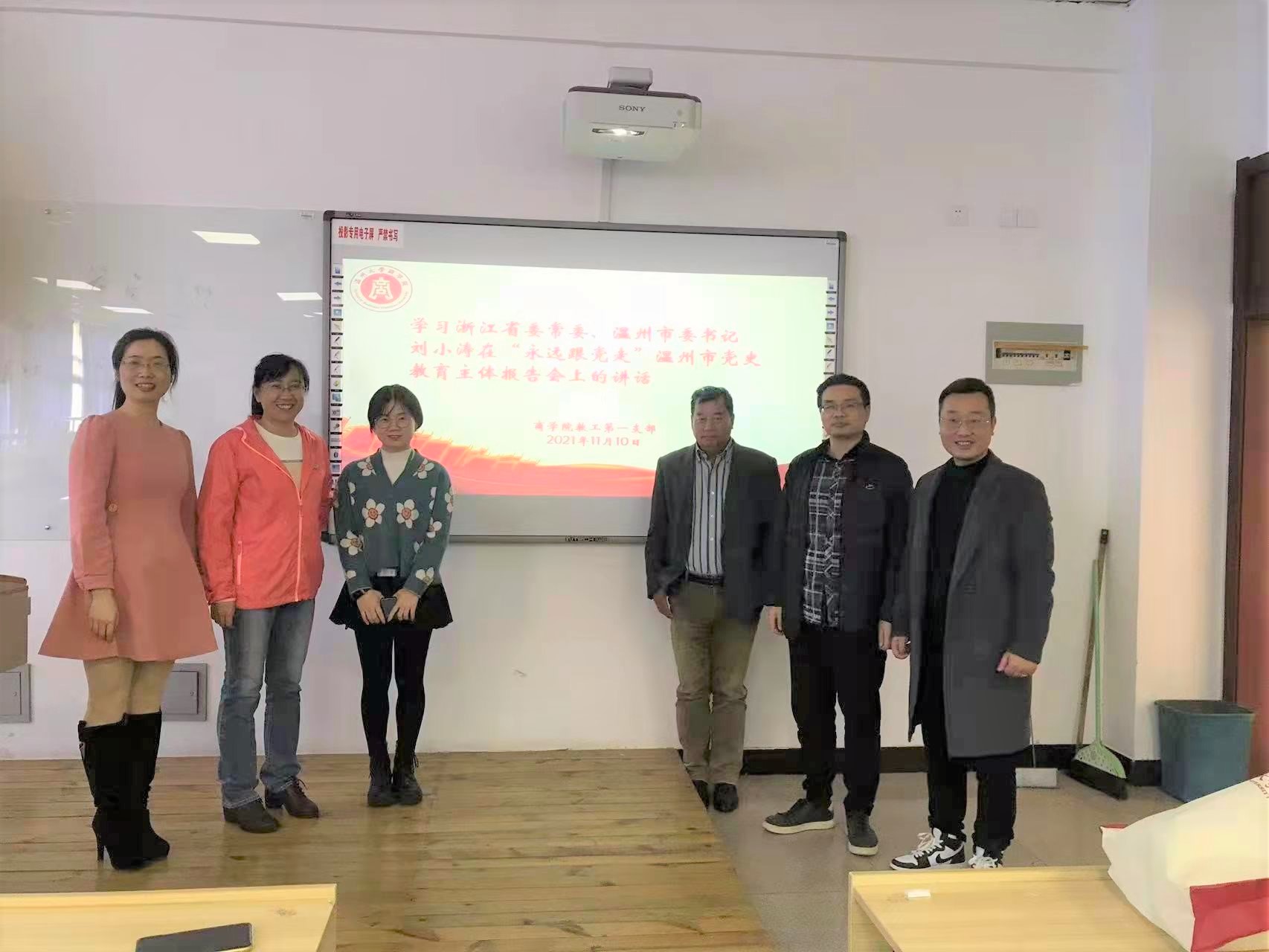 教工第一党支部召开以“学习浙江省委常委、温州市委书记刘小涛在‘永远跟党走’温州市党史教育主题报告会上的讲话”的专题学习活动,会议由支部委员王芳芳老师主持。