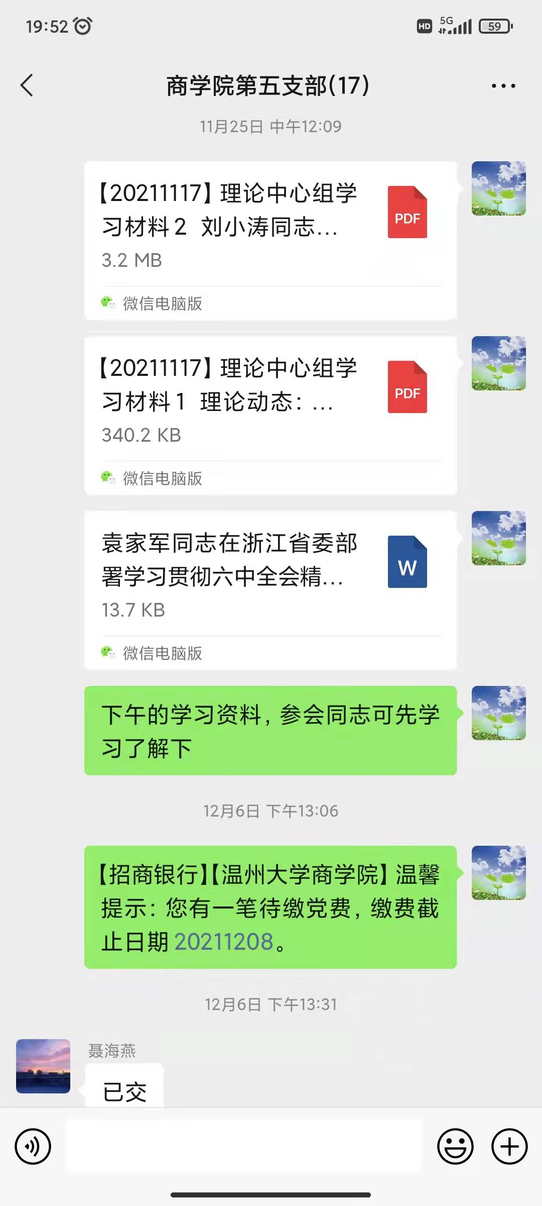 支部书记黄兴利老师在微信群里引用了11月份发布的六中全会精神学习资料,包含十九届六中全会6篇、刘小涛同志在“永远跟党走”温州市党史学习教育主题报告会上的讲话、袁家军同志在浙江省委部署学习贯彻六中全会精神“六讲六做”大宣讲活动讲话精神等,进行了集中再次学习,增强学懂弄通做实习近平新时代中国特色社会主义思想的高度自觉,以“浙江之窗”展现习近平新时代中国特色社会主义思想的真理力量和实践伟力。