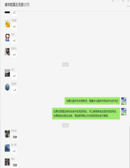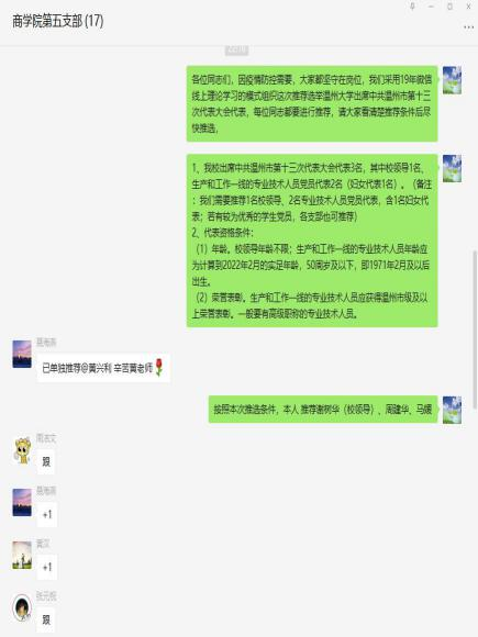 出席中共温州市第十三次代表大会代表议程,推荐人员要求已经提前在支部群里宣布本次被推荐人选的条件,本次会议进行正式推荐,即推荐校领导1名、生产和工作一线的专业技术人员党员代表2名(妇女代表1名)。