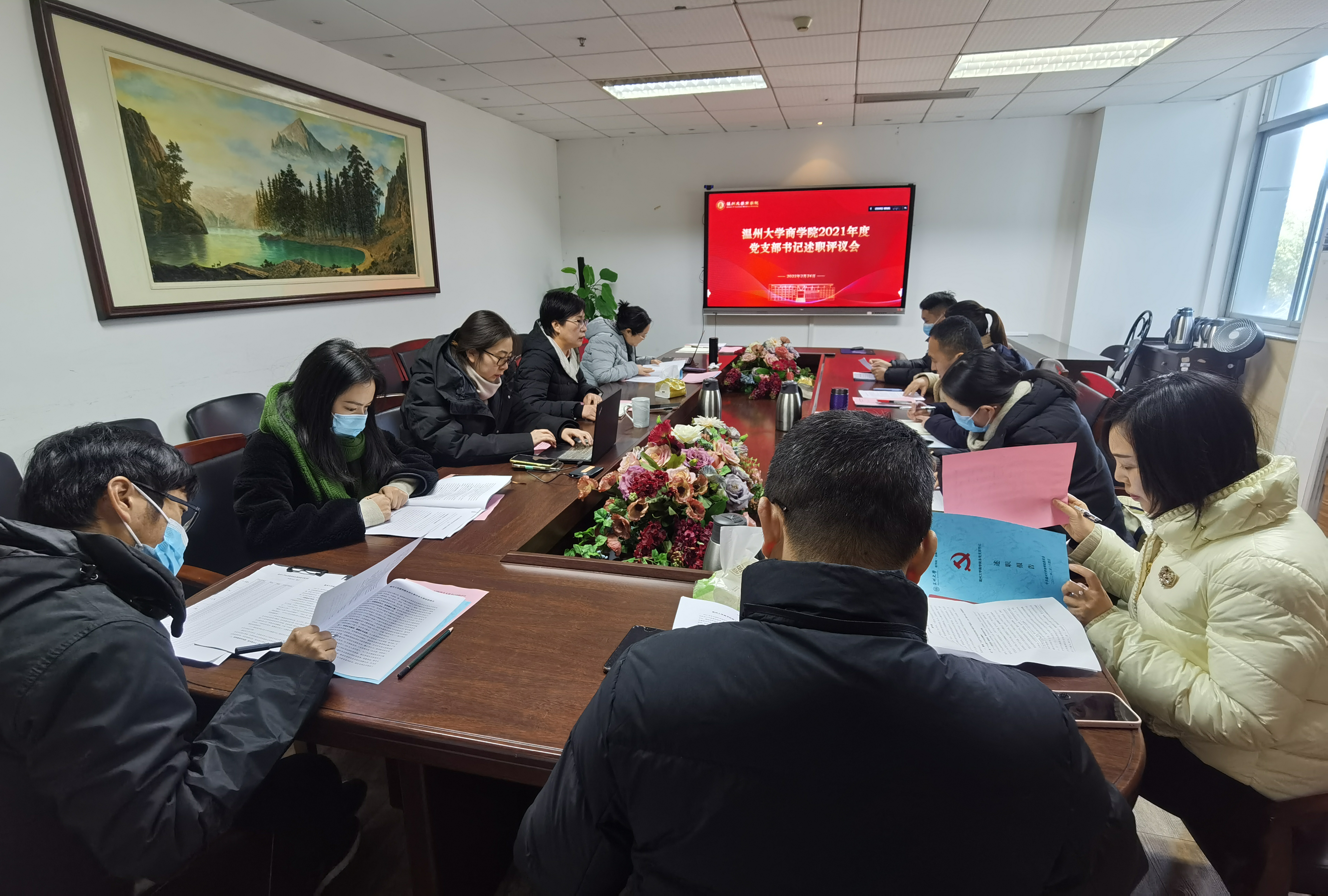 党委在A222会议室召开了2021年度支部书记抓党建工作述职汇报会。院党委书记郑彩莲、副书记唐华、党委委员周建华、周洁文、党务秘书聂海燕出席会议,12个师生支部书记参会。