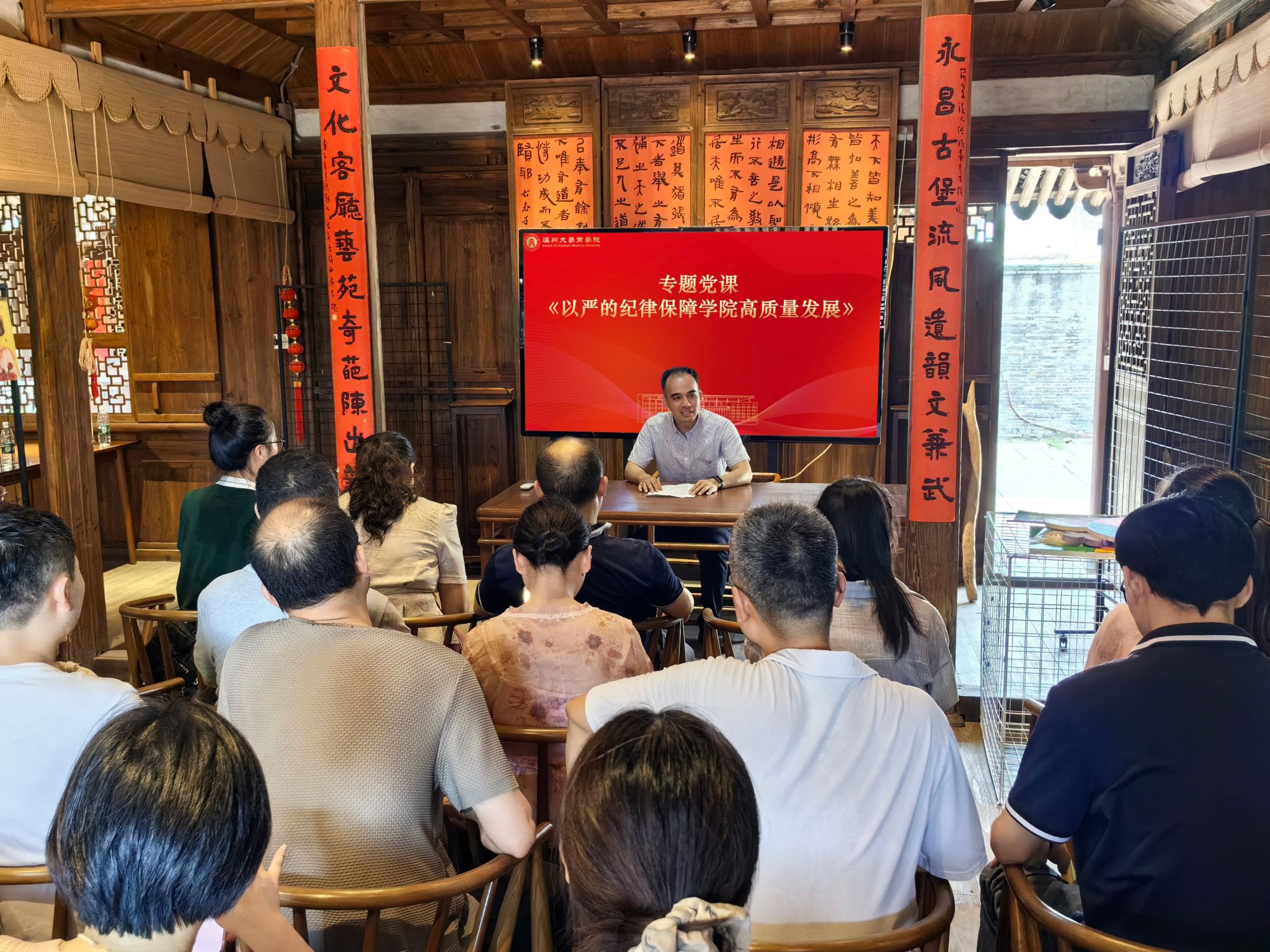 为进一步深化党纪学习教育,学院院长罗建利为全体党员上了一堂以“以严的纪律保障学院高质量发展”为主题的专题党课。他结合典型案例教育引导教工党员要把党纪学习教育融入日常工作、论文撰写、课题申报、科研经费使用等结合起来,使学习《条例》的过程真正成为增强纪律意识、提高党性修养的一个过程;强调党员干部们要强化责任担当,把开展党纪学习与立德树人根本任务相链接,进一步释放干事创业的活力,保持战略定力和耐力,以党纪学习教育成效促进学院事业高质量发展。