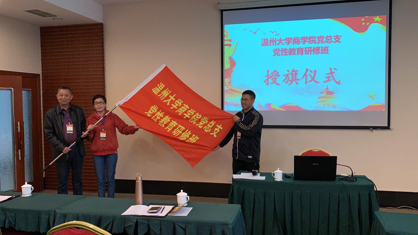 随后还举行了授旗仪式。由郑彩莲书记与胡振华院长向总支委员毛华配授本次研修班的班旗。