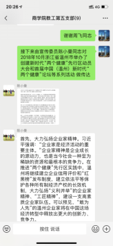 支部书记黄兴利事先在微信群里做了预告,晚上8点准时发出本次学习资料: “两个健康”,由支部书记黄兴利对“两个健康”做了背景介绍,由组织委员周飞对“温州市创建新时代“两个健康” 发展先行区总体方案”做解读,由宣传委员陈小曼对“温州市创建新时代“两个健康”先行区动员大会和首届中国(温州)新时代“两个健康”论坛”做精神指导。并设置了在线抢答,支部书记出题,党员抢答,热闹非凡。各位党员在群里也纷纷发表自己的观点,面对面的交流变成线上交流,带来了很多新意。