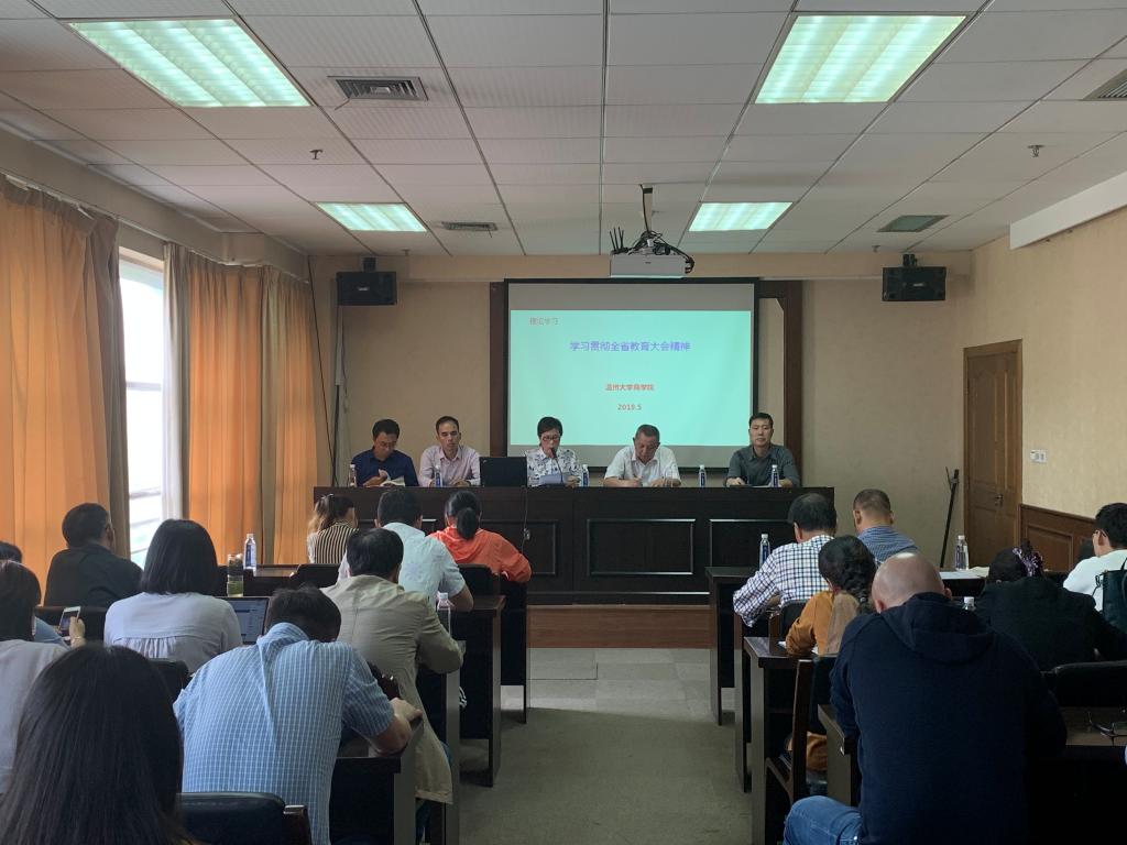 学习会上,郑彩莲指出,自3月份以来,学院班子、中心理论组、各党支部已逐批学习贯彻落实全省教育大会精神,学院全体教职工仍需全面系统深度地学习大会精神和校党委14号文件精神,要求全体师生提高政治站位,切实把思想和行动统一到全省教育大会精神上来;深刻领会精神,奋力书写新时代学校改革发展的新篇章;精心谋划,注重结合,努力形成学习贯彻大会精神的浓郁氛围。