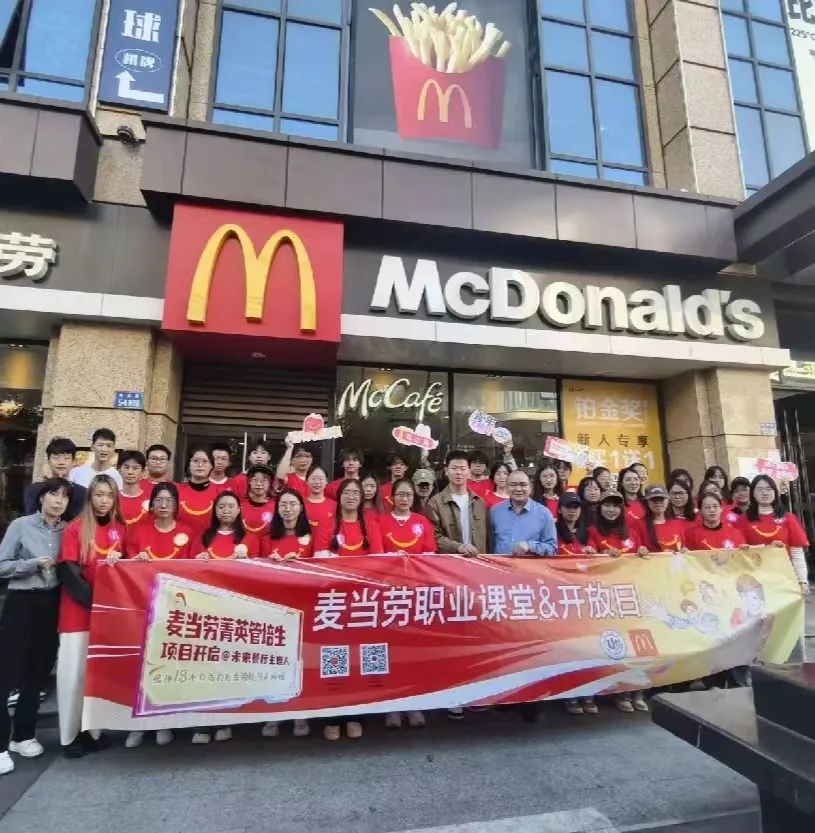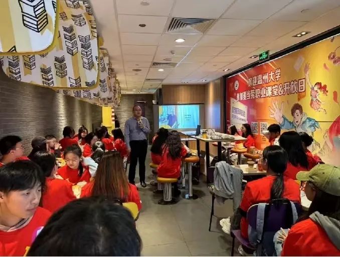 接下来,浙江市场营运经理郑贵从数字化方面向同学们展示了麦当劳发展的无限潜力。郑贵经理通过播放麦当劳南京科技研发中心的相关视频,让同学们更加深入的了解麦当劳线上APP的发展历程。视频也向大家展示了麦当劳始终坚持以为顾客带来更好体验为目标,提升数字化及会员体验,秉持“敢于突破,拥抱变革”的发展理念,不断推动业务数字化与办公数字化的发展。同时,郑贵经理提到麦当劳紧跟时代步伐,拥有强大的自有媒体与私域流量,通过官方网站、微信公众号、小红书等自媒体平台,进一步扩大企业影响力。对于菁英人才项目,郑贵经理向同学们介绍了雇员价值定位理念,并提出“实现自我增值,共创可持续的职业发展空间”,“以灵动的工作方式,悦享多元的职场体验”等目标,使同学们知悉麦当劳对青年人才的期许并且明确了未来发展的目标。