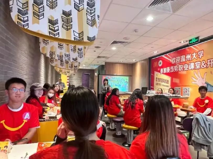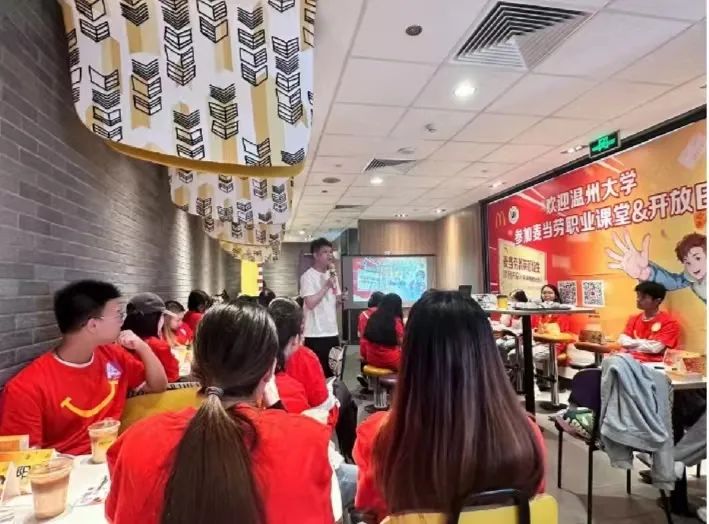 在接下来的环节中,浙江市场人事经理马程以自身经验与成长历程为例,向同学们讲解了他与麦当劳的故事。马程经理以日常工作、课程培训等内容为切入点,生动描述了麦当劳团结友爱的工作氛围和先进完善的人才培养机制。之后,马程经理通过剖析自身例子,向大家介绍了麦当劳自主研发的一站式培训平台和该平台所涵盖的为提升员工能力而开展的各类实践与线上课程。与此同时,马程经理提出,麦当劳会定期开展技能大赛、夏令营、年会等活动,通过丰厚的福利待遇与良好的人文关怀来激发员工积极性与企业活力。而这也提高了同学们今后加入麦当劳的热情。
