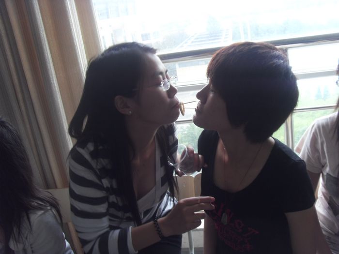 那么第三个重量级活动——齐传洋葱圈也上场了。每个同学都拿到牙签并将牙签用牙齿咬住,游戏开始。每组都有一包洋葱圈,游戏规则则是第一个同学将洋葱圈穿入牙签后就不能用手触碰洋葱圈,其他成员也是。全程过程只能用牙签传递,中途若掉地则为作废。开始的口令一开始,同学就开始齐心协力传递,第二组则以一个洋葱圈之多胜第二组。同时第二组也因他们出色表现得到相应奖品。