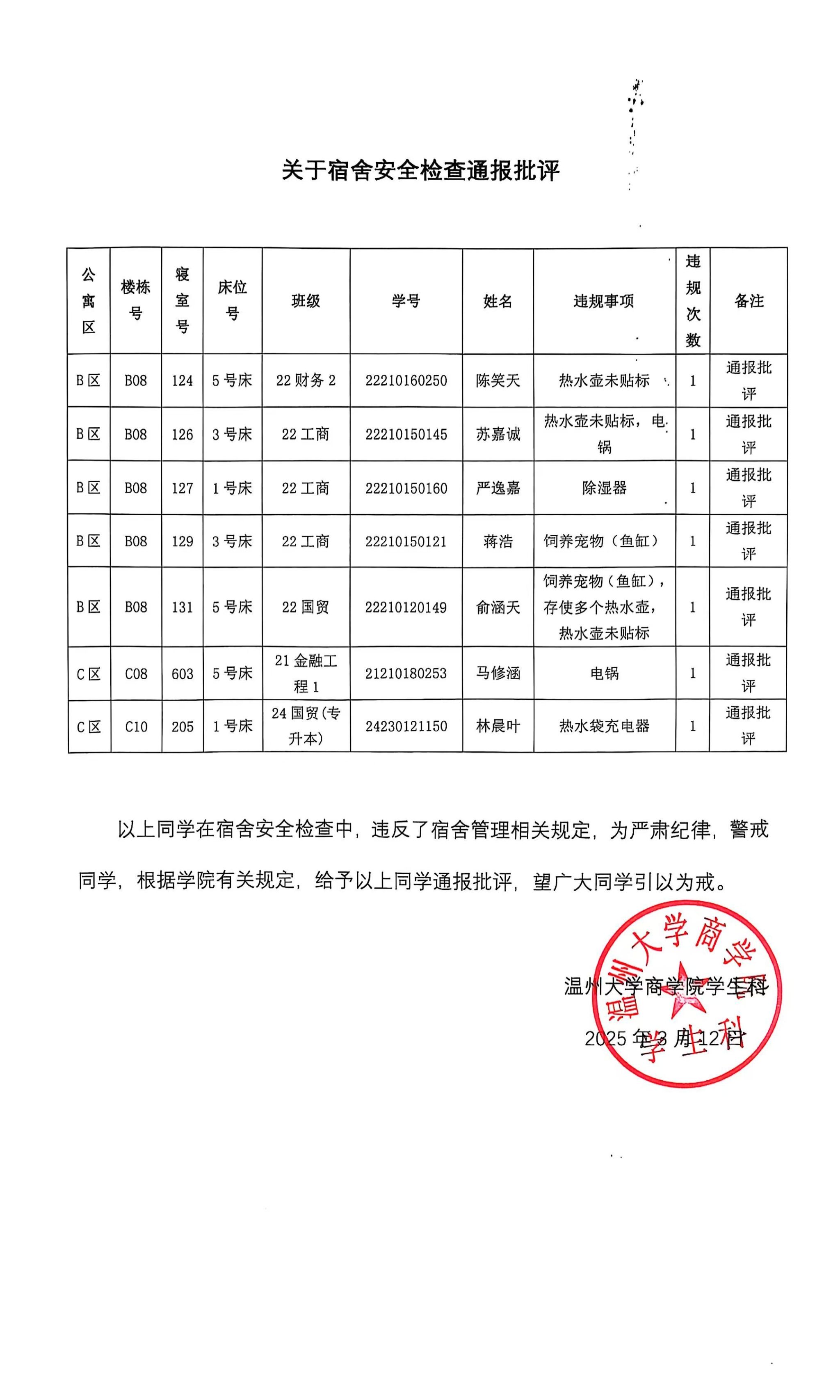 关于2024/2025学年第二学期开学初学生公寓安全检查通报批评的通知
