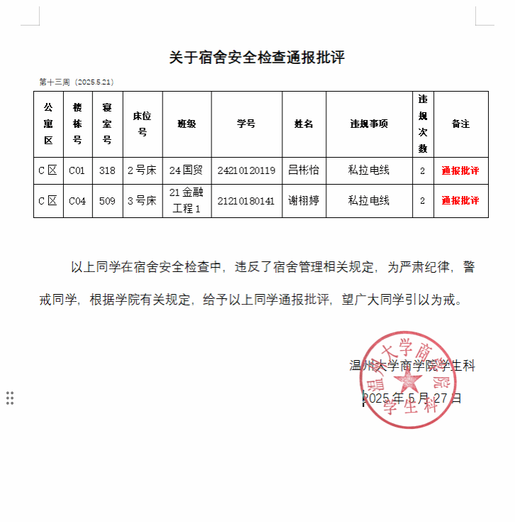 根据学校学生公寓安全“四级联查”工作机制要求,学工部、研工部、公管处、保卫部、资产公司等部门协同于5月21日对学生公寓区安全情况进行检查,魔镜号 以下同学在宿舍安全检查中,违反了宿舍管理相关规定,给予通报批评处分,通报如下: