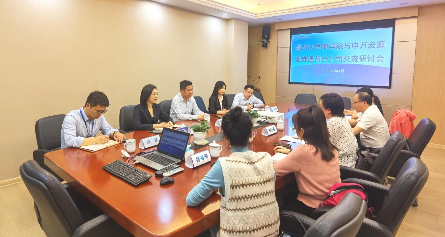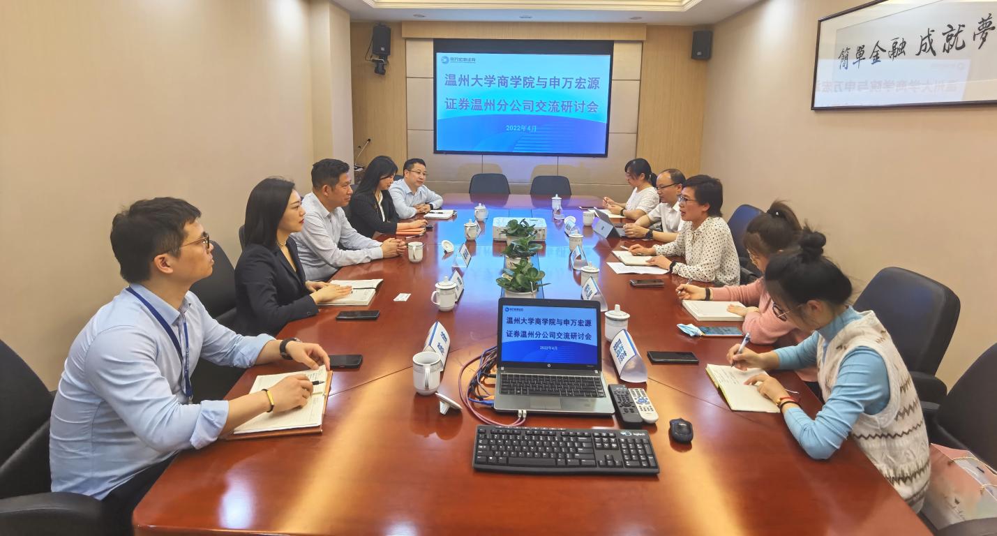 党委书记郑彩莲、教工第一党支部(金融系)支部书记周建华、金融工程专业教师王芳芳、熊礼慧、学院党务秘书聂海燕一行赴申万宏源证券温州分公司开展交流研讨会。会上,双方就如何深化银校共建、拓展人才培养平台等问题开展深度交流。