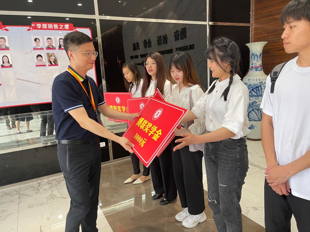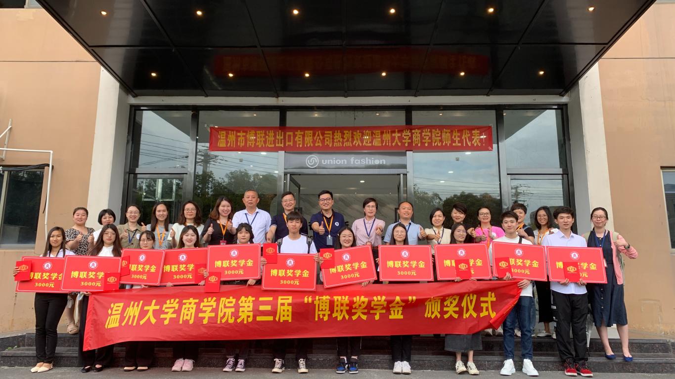 院长胡振华、党委书记郑彩莲、党委副书记唐华、国际经济与贸易专业负责人林俐教授、学工办副主任周洁文、辅导员马金凤及获奖学生一行到温州市博联进出口有限公司举行第三届“博联奖学金”颁奖仪式,此次选址在校友公司,一方面是为感谢90级钱旦初校友、94级徐开晴校友捐款设立的“博联奖学金”,另一方面也带领学生参观企业,让他们切实感受企业文化,做到理论与实践相结合。仪式由唐华副书记主持。