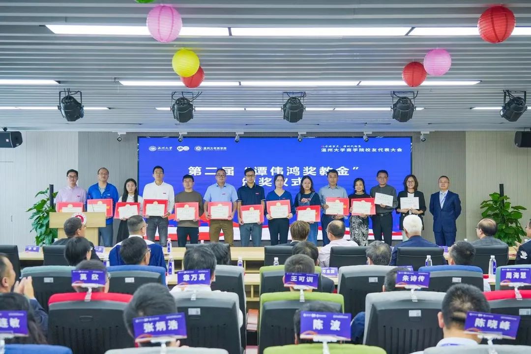 大会举行2022-2023学年“谭伟鸿”校友奖教金的颁发仪式。谭伟鸿校友为获奖老师颁奖并进行合影留念,其中获得奖教金的有“教学先锋”型模范陈敏、陈明灼、金必简、国贸教学团队,“科研先锋”型模范白延虎、李国志、李永盛、王瑛、章素珍,“育人先锋”型模范王洪斌,“管理服务”型模范有工会、教务科、培训中心综合服务团队。