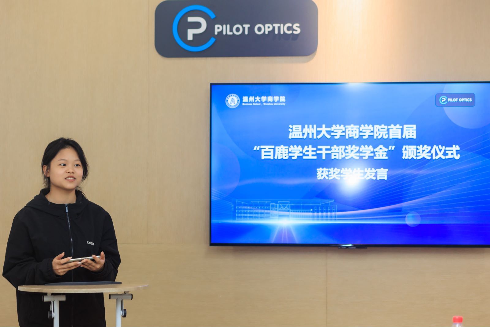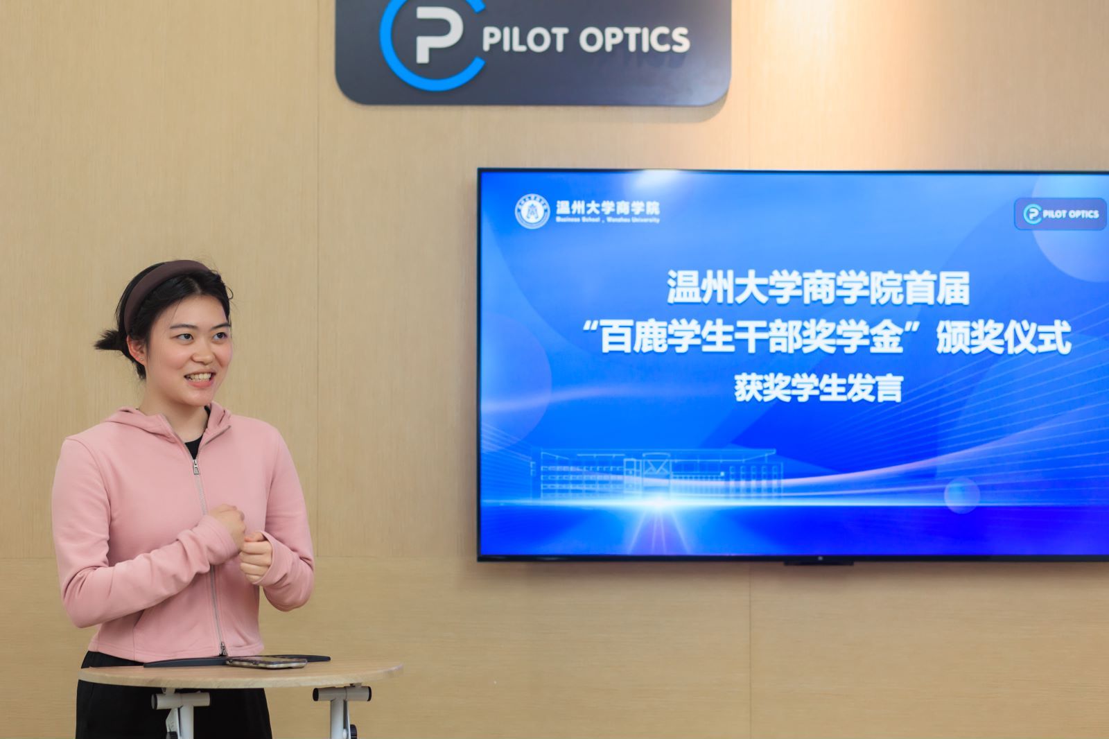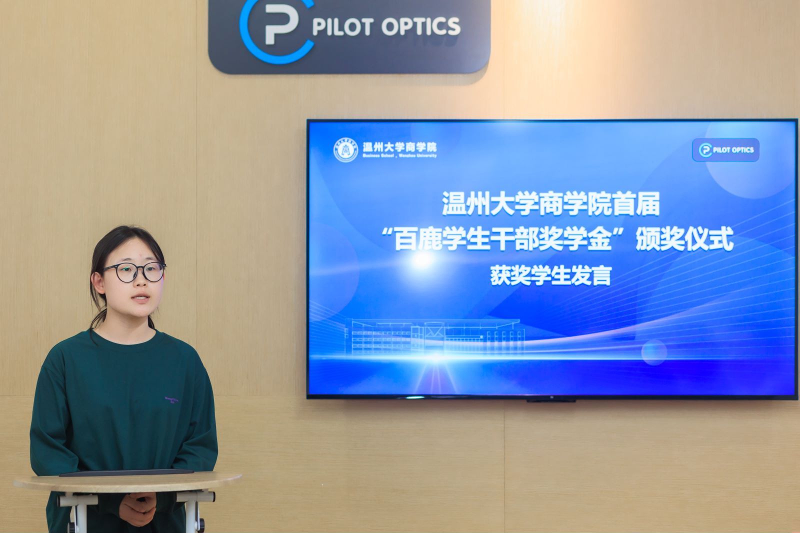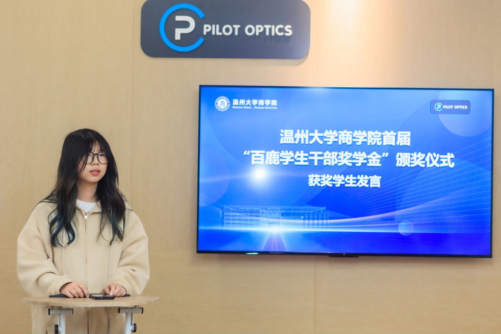 谢明明校友在祝贺首届“百鹿学生干部奖学金”获得者的同时,分享了她的创业经历和从业感想,她首先介绍了中国外贸行业的现状与前景,鼓励同学们积极学习AI工具,掌握人工智能等前沿技术,同时强调:人类情感和洞察力无法被AI替代,未来依然有很多工作是人工智能无法替代的,特别是那些需要人类特有的情感智能、复杂决策和人际交往能力的工作。这就更加凸显学生时代积极参加学生干部工作的重要性,借此培养领导力、沟通能力和团队合作能力。谢明明校友谈到,在魔镜号 求学及学生干部经历,让她受益良多,也为她的事业奠定了基础。为感恩母校、激励学生,她特别设立学生干部奖学金,鼓励学生干部发挥才能,贡献学校。她感激母校培养,同时也给在座的学生干部们提出殷切期望,强调要牢牢把握在校担任学生干部的机会,在多次试错中学会思考、提升解决问题和综合管理能力。