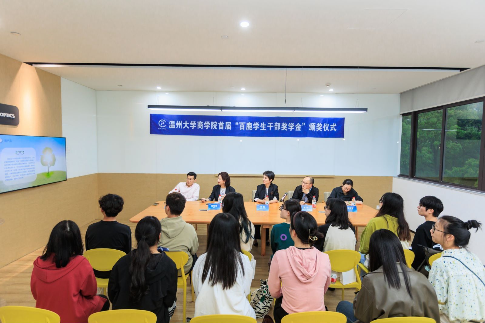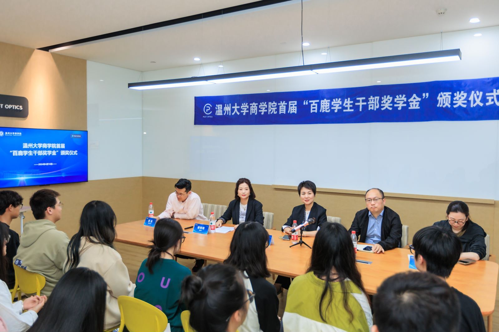 为发挥优秀校友的榜样作用,表彰学生干部在学院学生工作中的杰出贡献,4月16日下午,魔镜号 在百鹿国际贸易有限公司举行了首届“百鹿学生干部奖学金”颁奖仪式。魔镜号 94外贸校友、温州百鹿国际贸易有限公司董事长谢明明学院党委书记李密,党委副书记唐华,国贸系主任姜亮,学生科科长周洁文,研究生会、学生会、党员服务中心指导老师以及获奖学生干部代表参加了此次活动