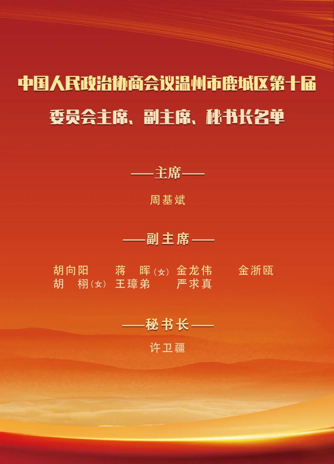 大会宣布:周基斌当选为政协第十届温州市鹿城区委员会主席;胡向阳、蒋晖、金龙伟、金浙瓯、胡栩、王璋弟、严求真当选为政协第十届温州市鹿城区委员会副主席;许卫疆当选为政协第十届温州市鹿城区委员会秘书长;王小粉等43人当选为政协第十届温州市鹿城区委员会常务委员。