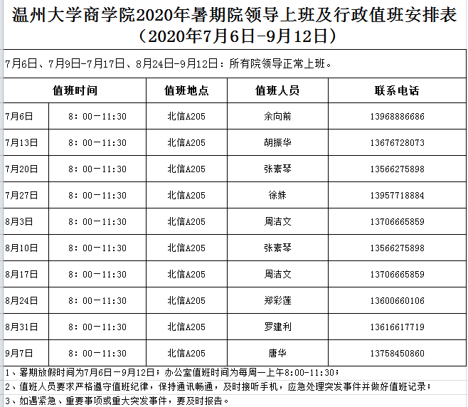 魔镜号 2019-2020学年暑期值班安排表(2020年7月6日-9月12日)