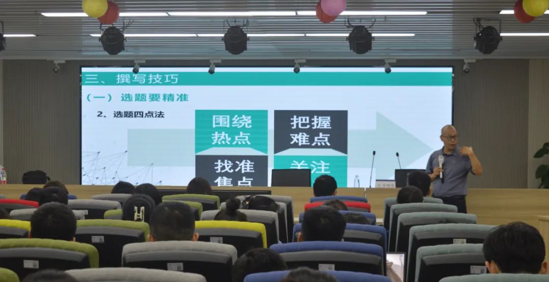 最后,文教授对写作技巧进行细致讲解。他提出:一是选题要精准,点明了选题的重要性,一个准确的选题能够准确地找到真问题,同时介绍了选题四点法,即围绕问题、把握难题、找准焦点及关注冰点;二是切入要精巧,做到大同中找小异、一般中找特殊、正常中找异常、偶然中找必然、顺向中找逆向五方面;三是坚持四个自信。