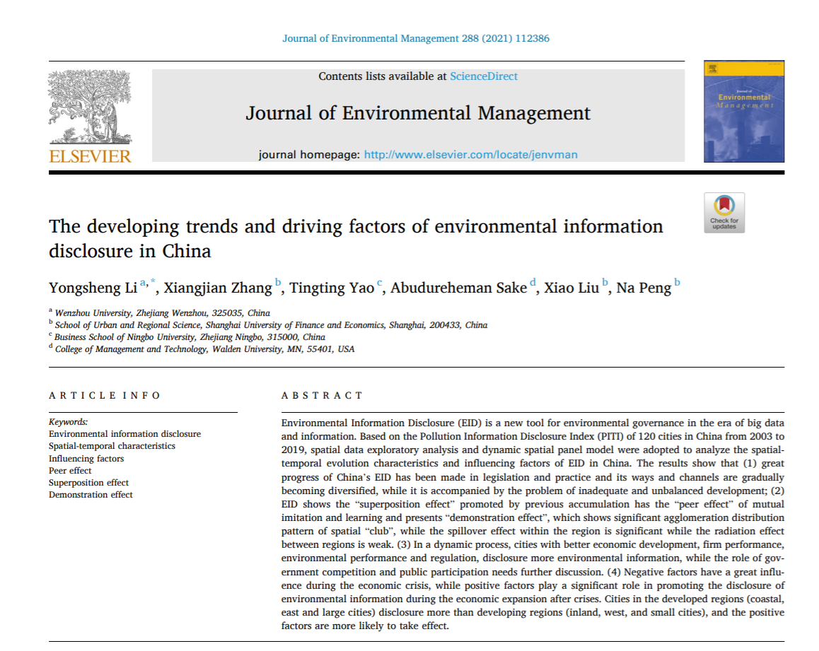 青年教师李永盛博士(第一作者)等撰写的学术论文《The developing trends and driving factors of environmental information disclosure in China》在国际期刊《Journal of Environmental Management》2021年第288卷发表。《Journal of Environmental Management》是环境管理学领域的国际权威期刊,深受各国环境科学与管理领域科学工作者的重视,按美国科学情报研究所(ISI)的期刊引证报告(JCR),该期刊最新的影响因子为5.647,处于环境科学领域一区(Q1),在环境科学大类265本期刊中排名第33,是中科院2区期刊、TOP期刊。