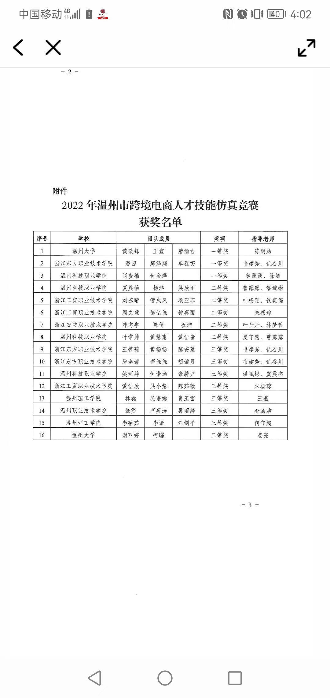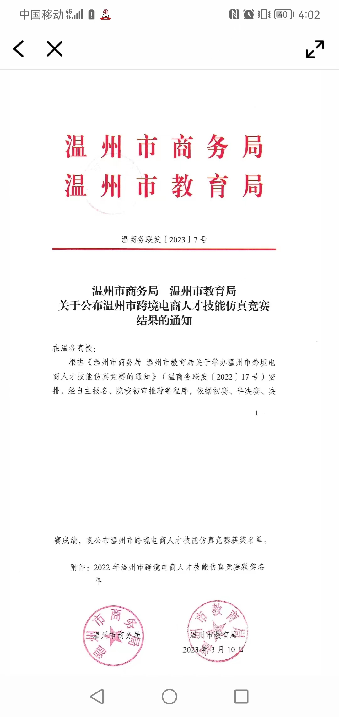 在2022年温州市跨境电商人才技能仿真竞赛中,魔镜号 获得二项奖励,其中陈明灼老师指导团队获一等奖,姜亮老师指导团队获三等奖。