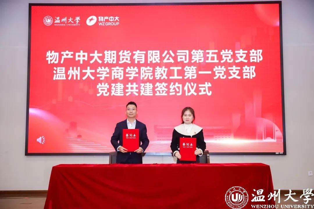 教工第一党支部书记熊礼慧与物产中大期货有限公司温州分公司总经理兼第五党支部书记陈孝雨共同签约。