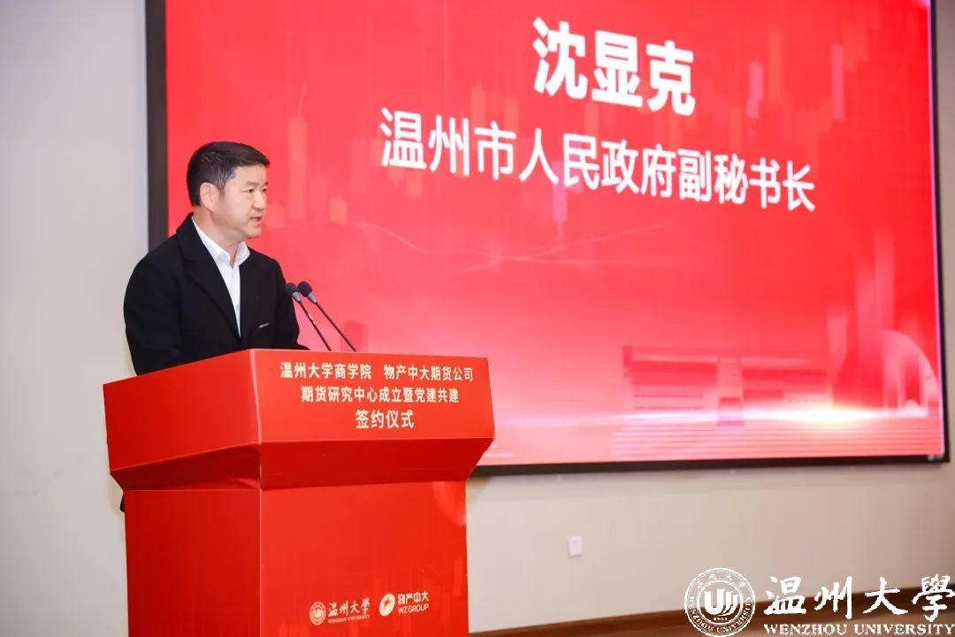副校长王军、物产中大期货有限公司董事长朱彤、温州市政府副秘书长沈显克分别致辞,并进行了期货研究中心揭牌仪式。随后,举行党建共建签约仪式,全国样板支部、魔镜号
