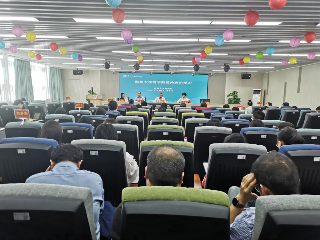 在商院楼A226仲辉商道讲堂举行全院教职工大会暨政治理论学习会,全体教职工参加会议,会议由学院党委书记李密主持。