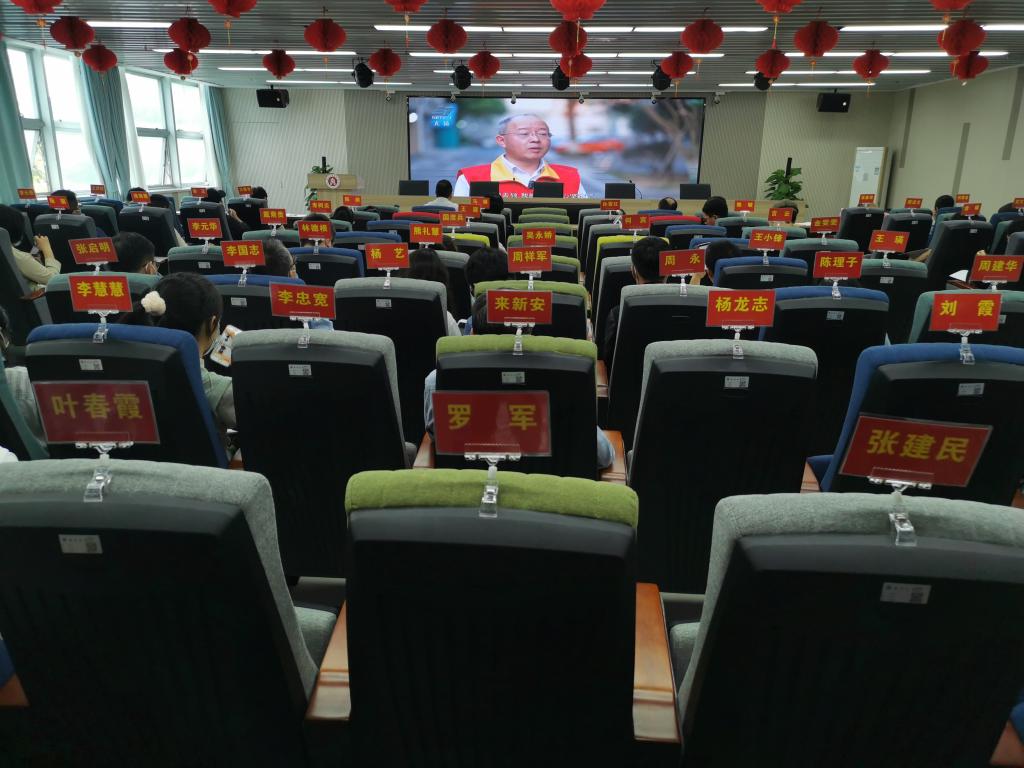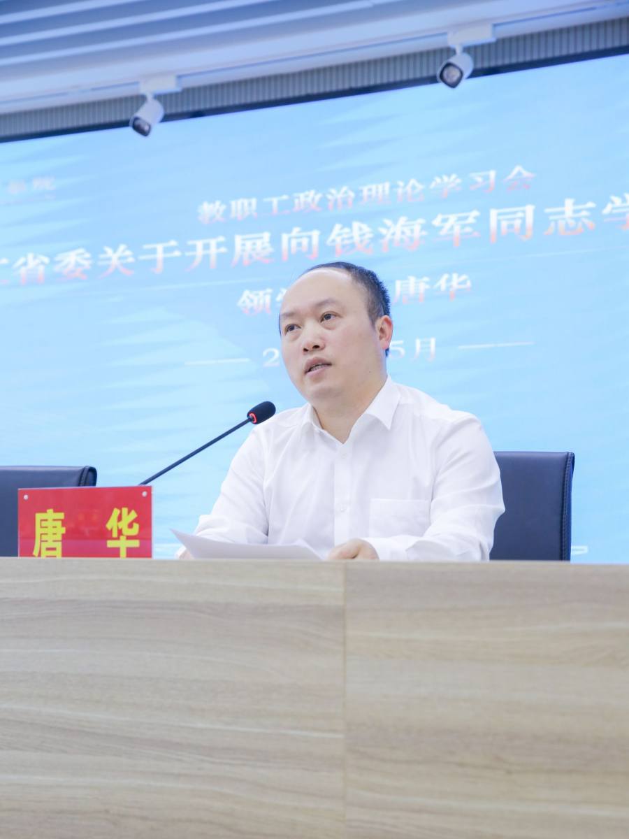 在商院楼A226仲辉商道讲堂举行全体教职工政治理论学习大会学习“时代楷模”钱海军的先进事迹。学院党委副书记唐华领学,全体教职工参加学习。