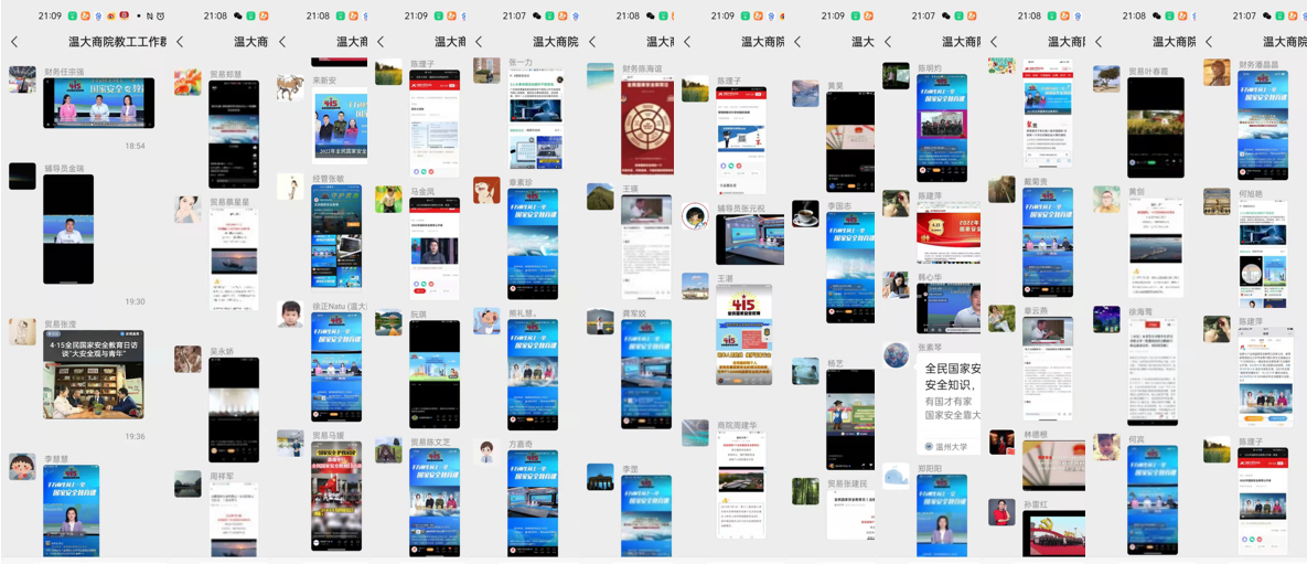 通过微信群组织全院师生线上参与教育部思想政治工作司重点宣传教育活动,包括观看“千万师生同上一堂国家安全教育课”主题公开课、“高校国家安全教育教学风采展示”,参与“国家安全教育主题短视频线上接力活动”等多种活动,学院师生参与热情高,安全教育意识强。