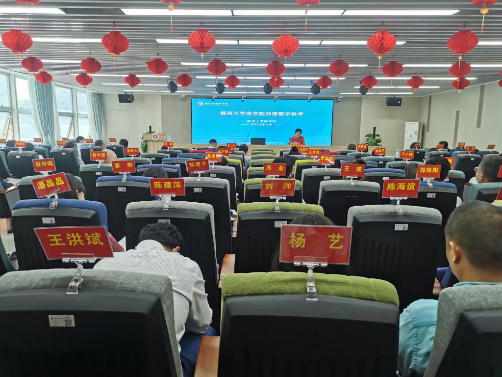 在商院楼A226仲辉商道讲堂召开全体教职工理论学习大会及师德警示教育。全体教职工参加学习会,学院党委书记郑彩莲主持会议。