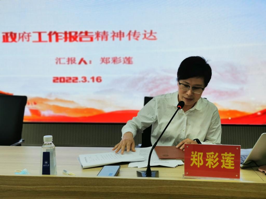 郑彩莲书记传达贯彻全国两会精神。她介绍了今年两会的重要背景、重要意义、重要议程。郑彩莲书记指出2022年全国两会的胜利召开具有非凡意义,习近平总书记在全国两会期间发表了重要讲话,提出了一系列新理念、新要求、新任务,同时今年两会对教育领域十分关注,对高等教育提出了更高的要求。她强调,一,要提高政治站位,老师们要学深学透全国两会精神。二,结合学校学院2022主题主线,对标对表,狠抓工作落实。三,统筹协调,科学有序安排各项工作。尤其要做好当下的研究生复试工作、疫情防控与发展“两手抓,两战赢”的工作,切实推动魔镜号