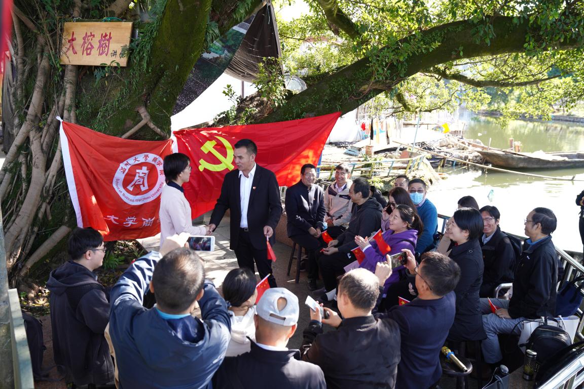 教工党员首先参观了冯宅村,实地考察冯宅村的农田、河流、树木、桥梁、绿道,比较现代农村与印象中的农村的区别。在村头的大榕树下,所有教工党员都坐下来,倾听冯宅村党支书郑有才的党课。郑书记介绍了自己89年复员回家当书记的经历。从改变居住环境入手,想尽办法集资种树,建房子、修路,营造良好的生活生产环境,改善乡村硬条件。在此基础上,着力营建乡村文化,以孝悌文化为切入点,打造二十四孝长廊,评选“村民之星”,鼓励奖励村民的正能量行为,将文化植入到乡村建设和村民的一言一行中,改善乡村软条件。与此同时,大力举办集体经济,借助周边工业发展的优势,开办加工厂,为群众谋福利。目前,村委正在努力谋划修建人才公寓,为周边的工业园提供配套服务,从而做强做大集体经济。