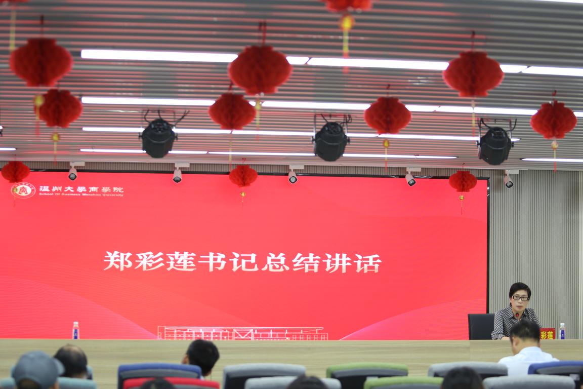 最后,学院党委书记郑彩莲在总结讲话中指出,“课程思政”建设重点在课程、关键在教师、着力点在体制机制;如何更好地在知识传播中强调价值引领,在价值传播中凝聚知识底蕴,需要广大教师以德立身、以德立学、以德施教,将立德树人根本任务贯穿教育教学全过程;同时需要强化基层党组织建设,突显政治引领功能。