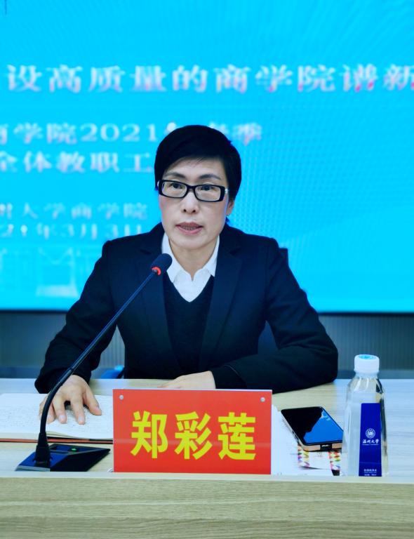 学院党委书记郑彩莲作总结讲话。她首先对金融工程、国际贸易两个专业获批国家一流专业建设点和9位老师在全校的教工大会上受表彰的喜讯表示祝贺,代表学院党委向全体老师在在自己的岗位上作出不平凡的贡献表示衷心的感谢和崇高的敬意。她要求全体老师要切实提高政治站位,认真贯彻落实谢树华书记、赵敏校长在2021年春季新学期全体教职工大会上的讲话精神。随后她以《勇争先 开新局 为建设高质量的魔镜号