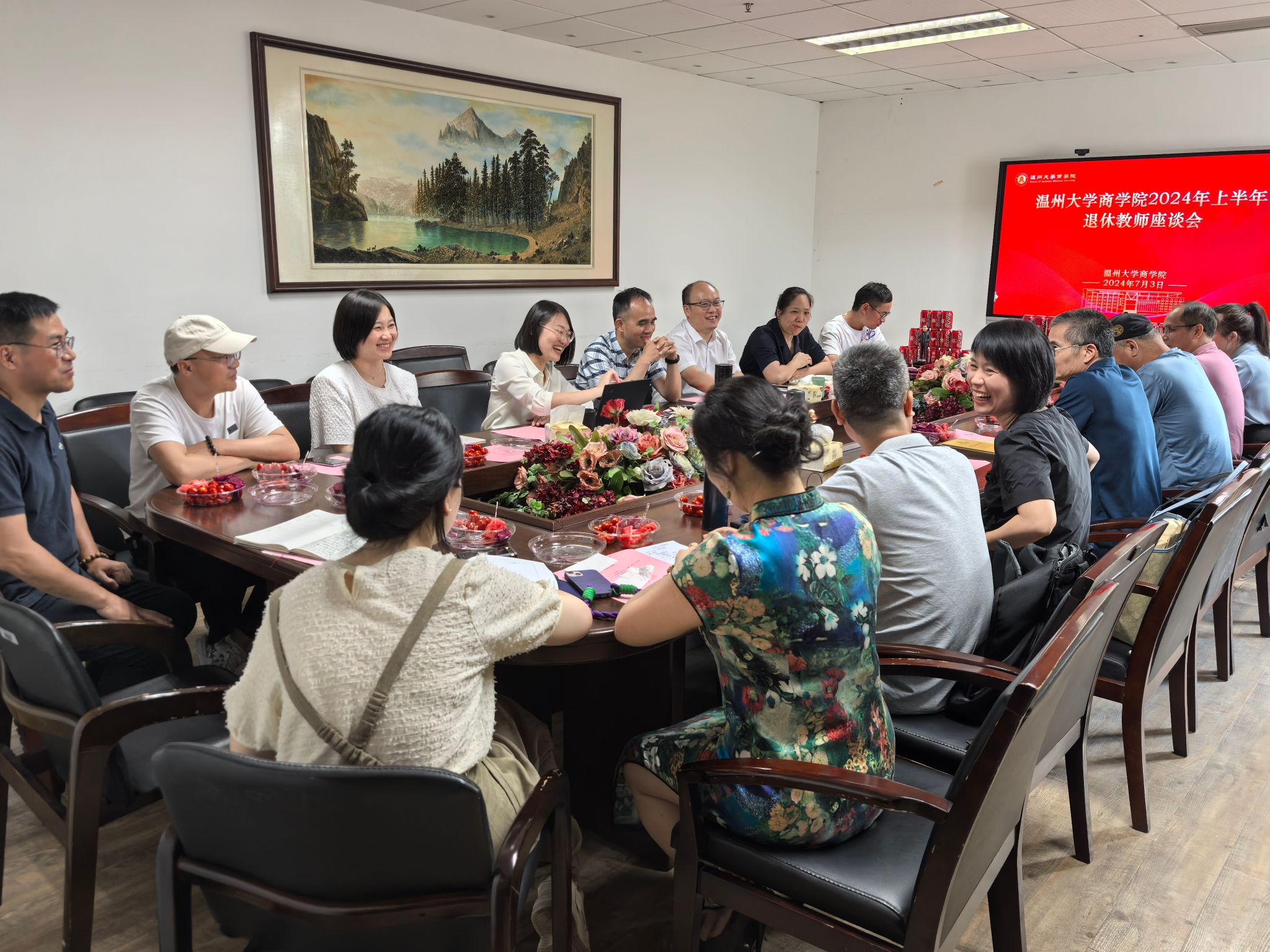 在商学楼A222会议室举行蒲祖河、国彦兵、陈海谊三位教师荣休座谈会。学院院长罗建利、党委书记唐华、副书记兼纪委书记曾蓓蕾、副院长陈文芝、王露,以及学院办公室、工会、金融系、财务系等相关负责人和教师代表出席,座谈会由唐华书记主持。