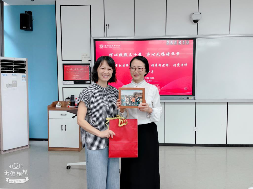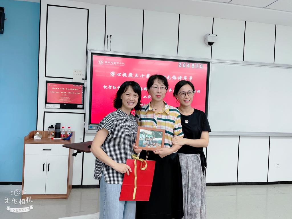 随后,妇联对学院四位教(工)龄超过30年的女教工 -- 张秀婷老师、孙雷红副教授、林俐教授、刘霞教授进行了表彰。四位老师入职30多年来,一直勤勤恳恳、兢兢业业,为学院的行政、教学、专业建设、学生课外竞赛等做出了很大的贡献。同事们纷纷回忆起与她们共事以来很多难忘的时刻,令人动容。为表达对她们的谢意,妇联也精心准备了礼物送给她们。