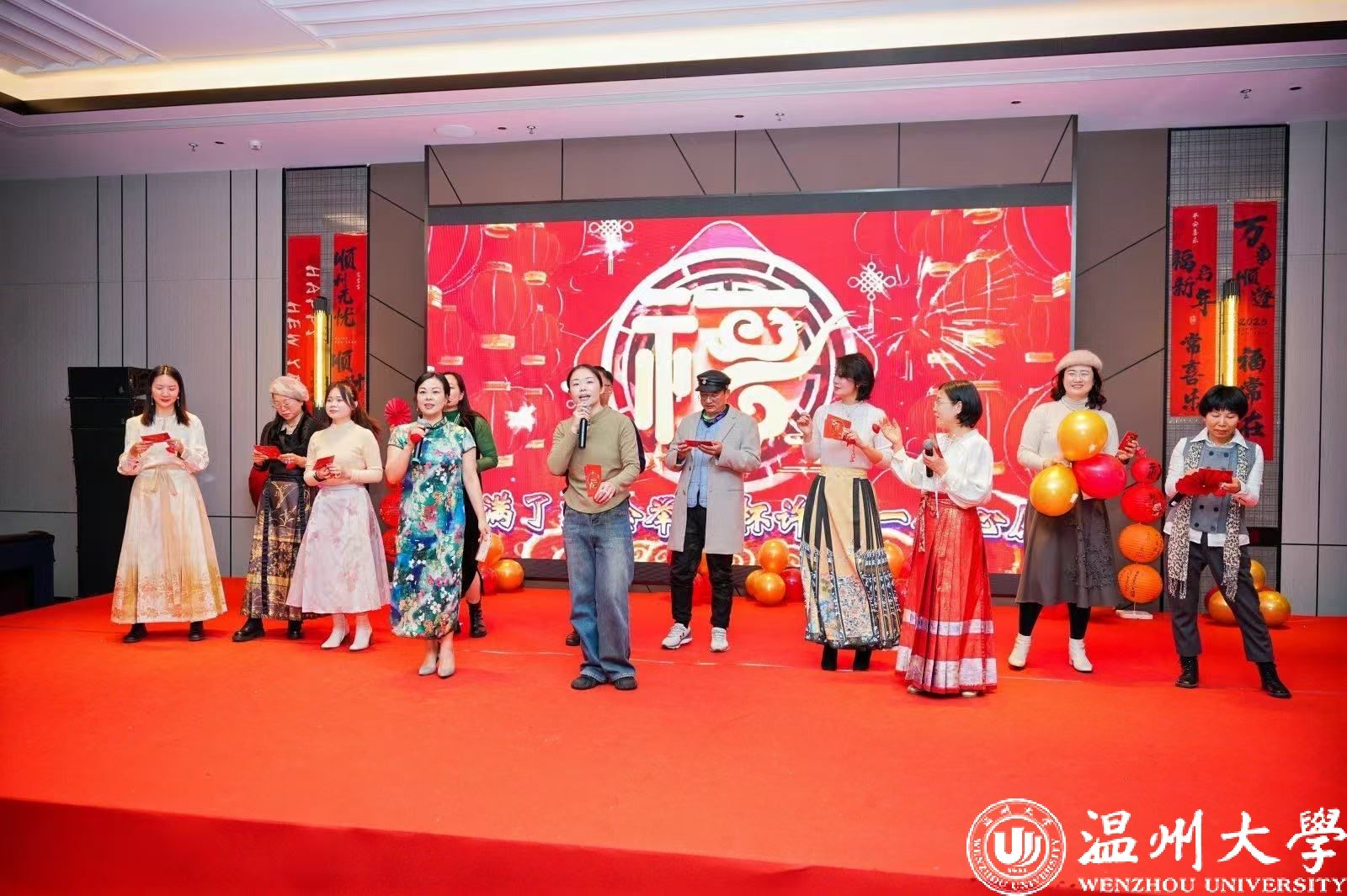 精彩节目轮番上演,学院领导集体深情献唱《敢问路在何方》,用歌声为年会拉开温暖又动人的序幕,各系和部门也纷纷亮出绝活,学工办的《精彩学工》、国际贸易系的《年轻的朋友来相会》、财务管理系的《城里的月光》、工商管理系的《我爱上班》、金融工程系的《我的中国心》、歌舞飞扬小组的《拜新年》、老师们的歌曲演唱以及各系办代表的精彩舞蹈,不同风格的节目相互交织,仿佛编织成了一幅绚丽多彩的美丽画卷,为年会持续注入热烈欢快的氛围。