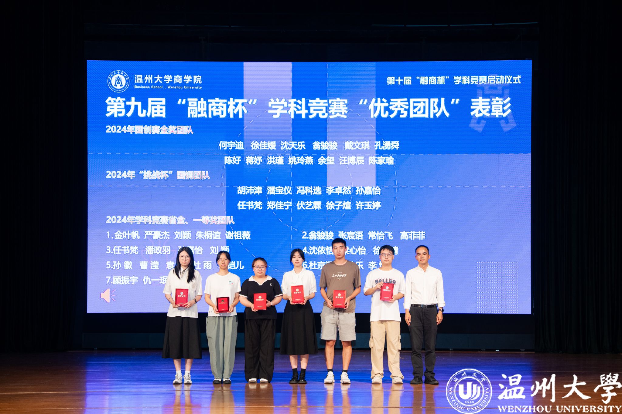 在颁奖环节中,第九届“融商杯”学科竞赛获奖团队代表依次登台,接受学院领导颁发的荣誉证书。这些沉甸甸的证书不仅是对获奖学子辛勤付出的肯定,更是对全体商院学子的激励与鞭策。